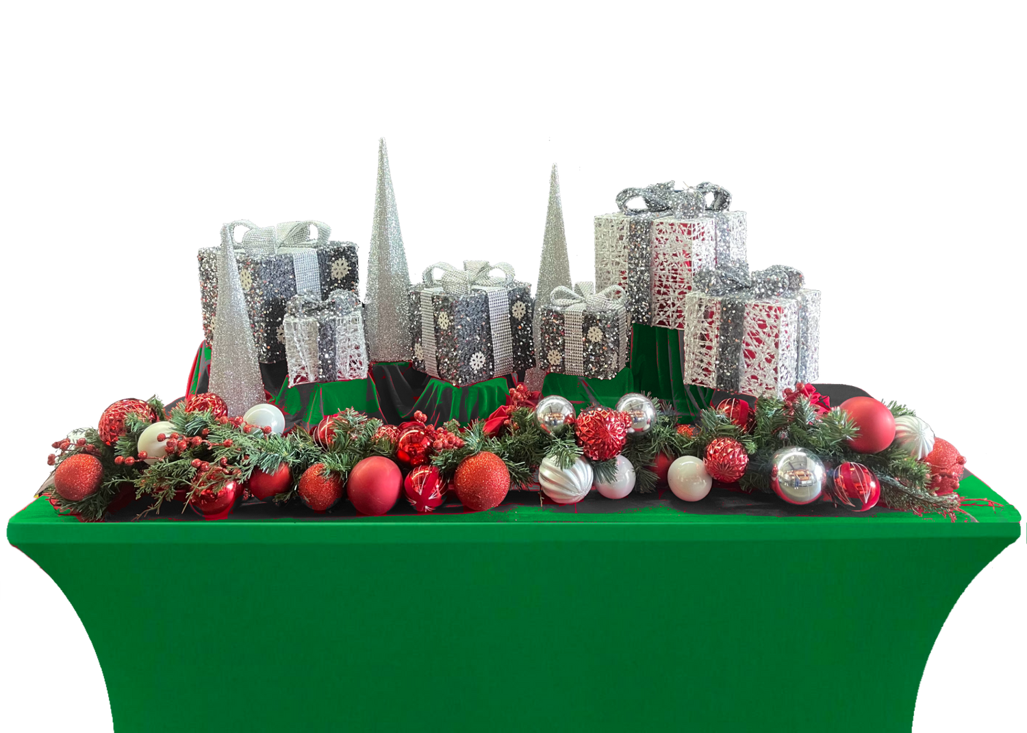 Holiday decor and music included with catered service. Tablecloth color customizable upon request.