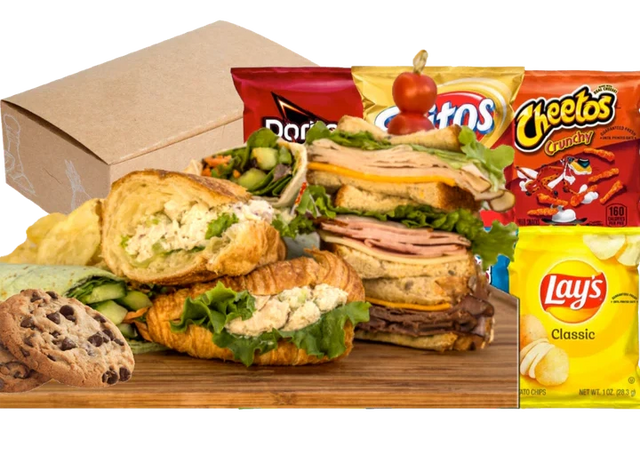 Our ultimate lunchbox includes a full deli sandwich or wrap of your choice, related condiments along with assorted Lays chips and a chocolate chip cookie.